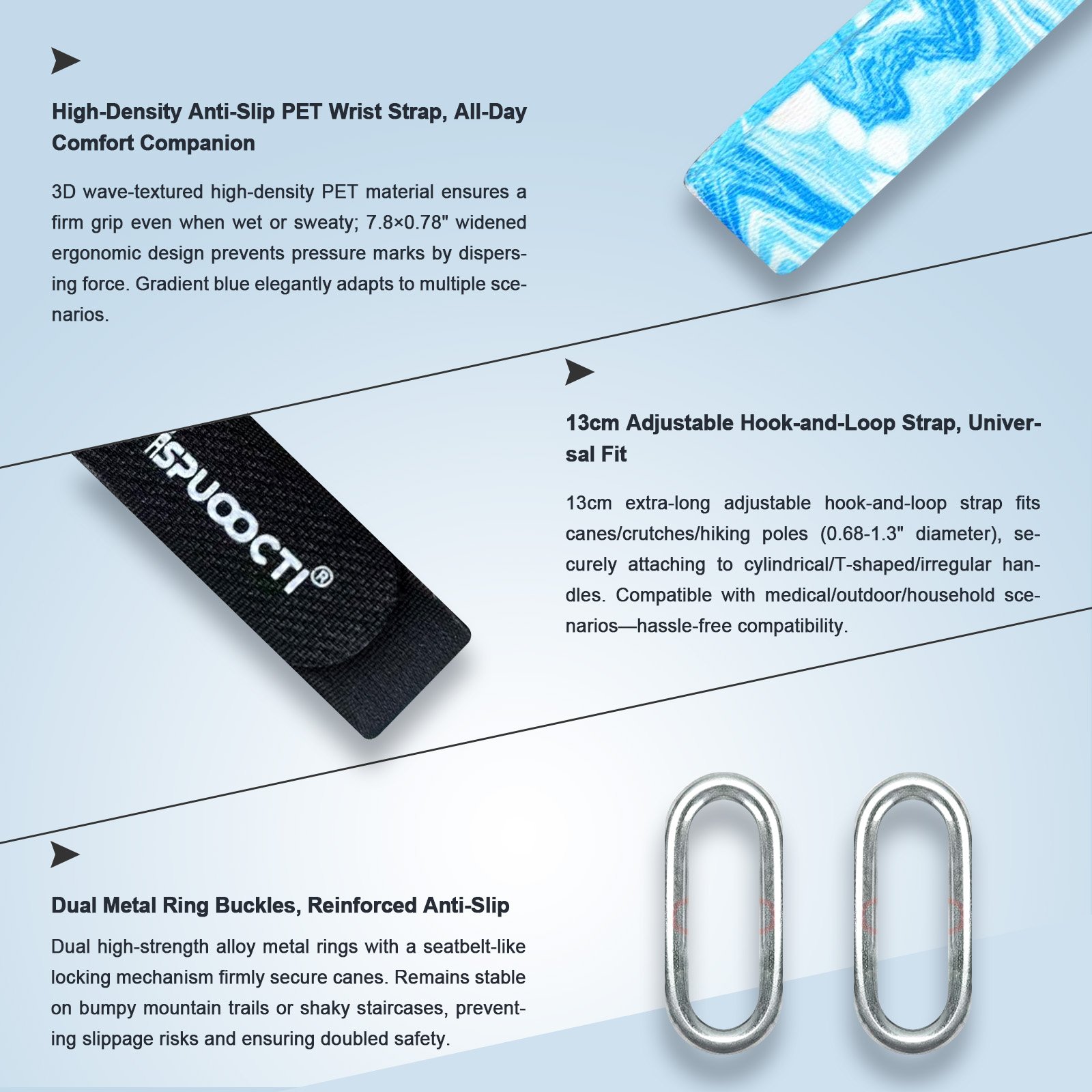 💃🕺【Fashion Gradient Blue, A Touch Of Elegance】The deep-to-light blue gradient pattern makes this wrist strap present elegant layered changes under different lighting. Transforming your walking aid into a stylish fashion accessory. Whether for business trips, social gatherings, or weekend outings, it adds a refined flair to your personal style.