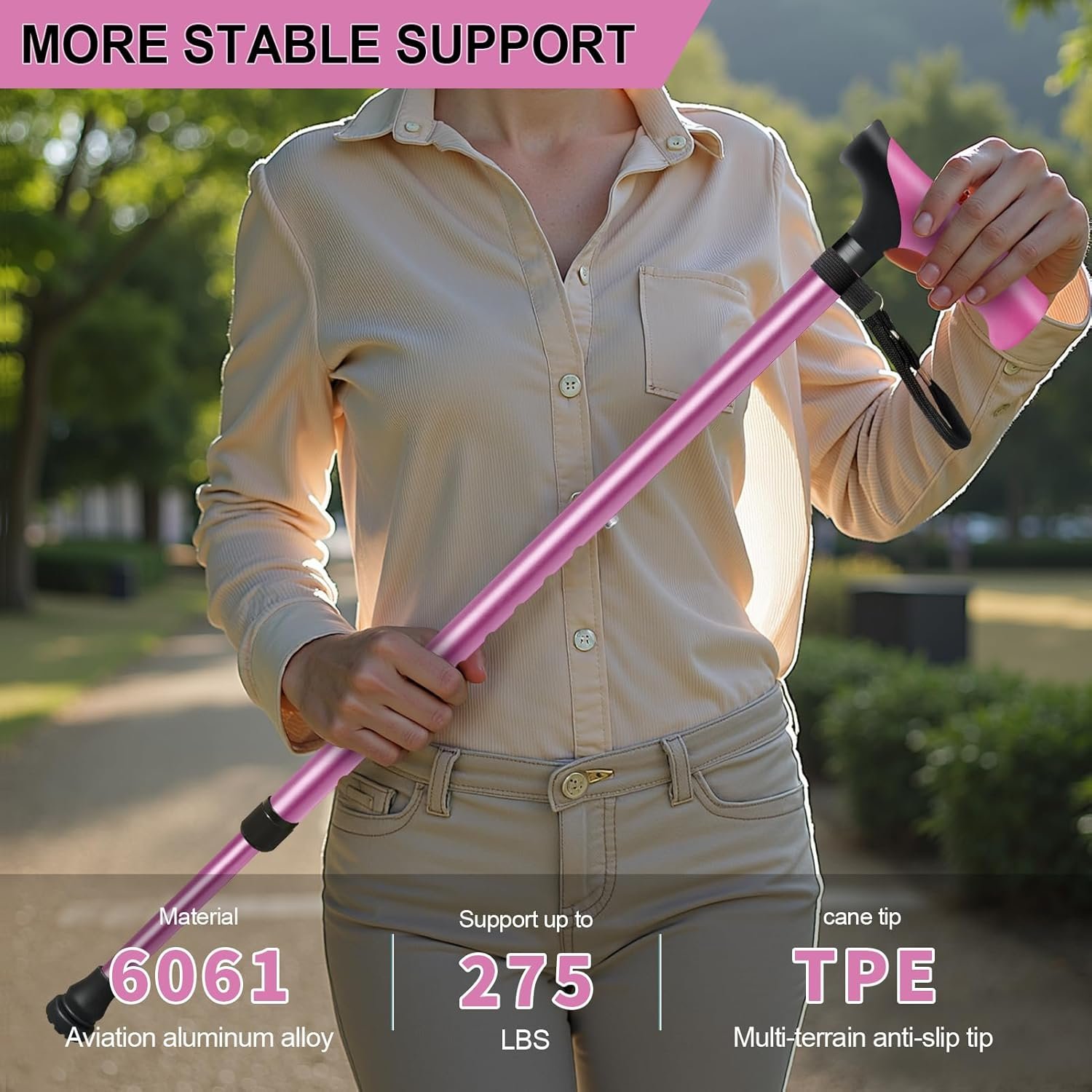 👨‍🦯【Aerospace-Grade 6061 Aluminum Alloy Lightweight Design|Supoort up to 275 Lbs 】Crafted entirely from aerlospace-grade 6061 aluminum alloy, this lightweight aluminum cane weighs just 0.77 lbs yet delivers robust 275 lbs load-bearing capacity. Its thickened 22.87-inch diameter tube wall provides 3x bending resistance, ensuring both structural durability and portability for all-day use.