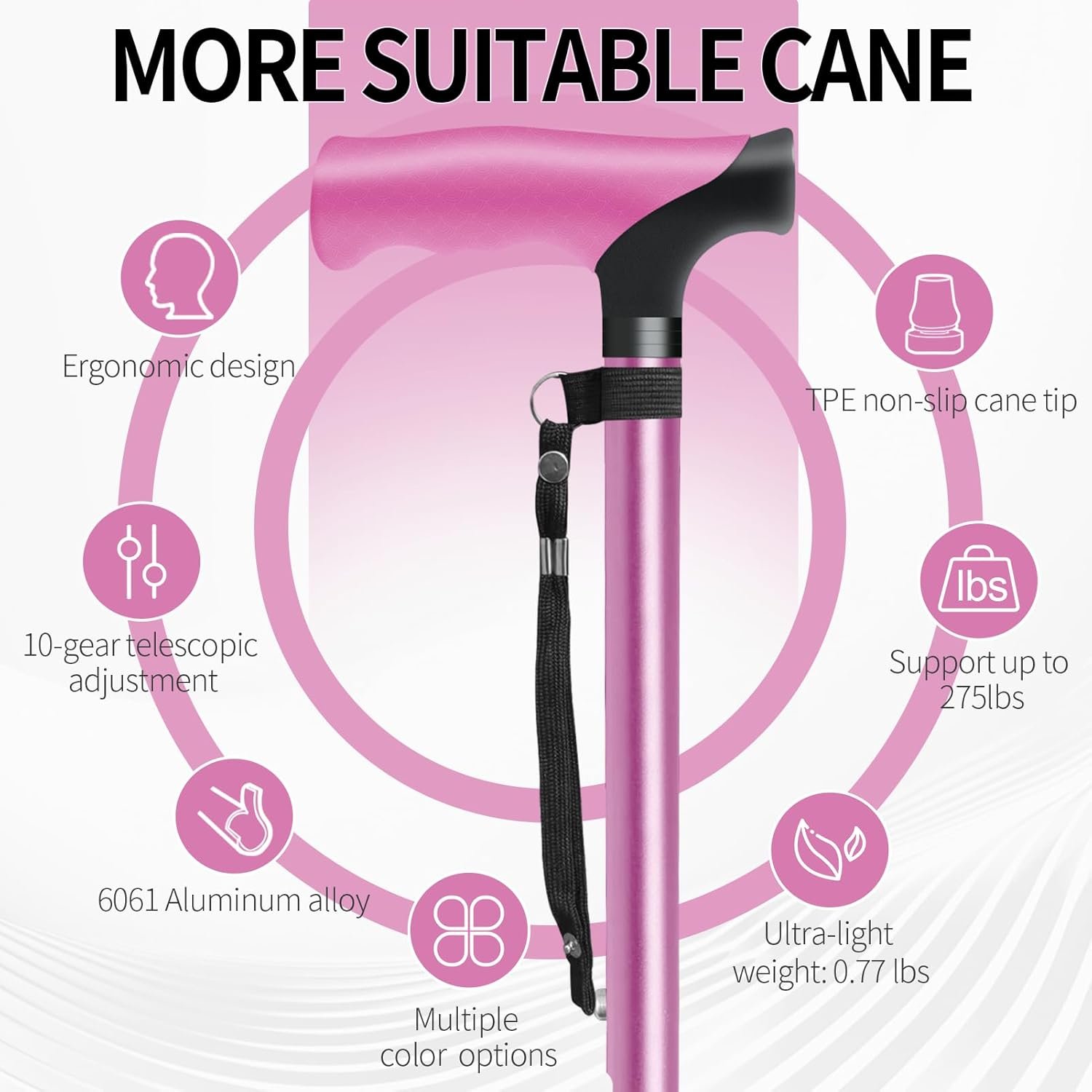 • ispuoocti Lightweight Adjustable 6061 Aluminum Alloy Walking Cane, Portable & Durable | Multi-Color Options | Comfortable Grip for Walking and Travel (Sakura Pink)