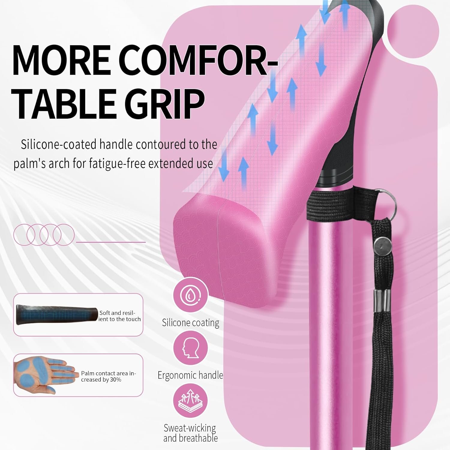 • 👩‍🦯【Anti-Slip Ergonomic Handle|Comfortable Grip 】 The cane handle features an innovative ergonomic curve that conforms to palm contours, increasing contact area by 30% to effectively disperse hand pressure. Breathable textured patterns combined with an anti-slip silicone coating ensure sweat absorption and secure grip integration: Comfortable during morning park exercises or grocery shopping—it maintains a firm hold even in rainy conditions or when hands are sweaty.