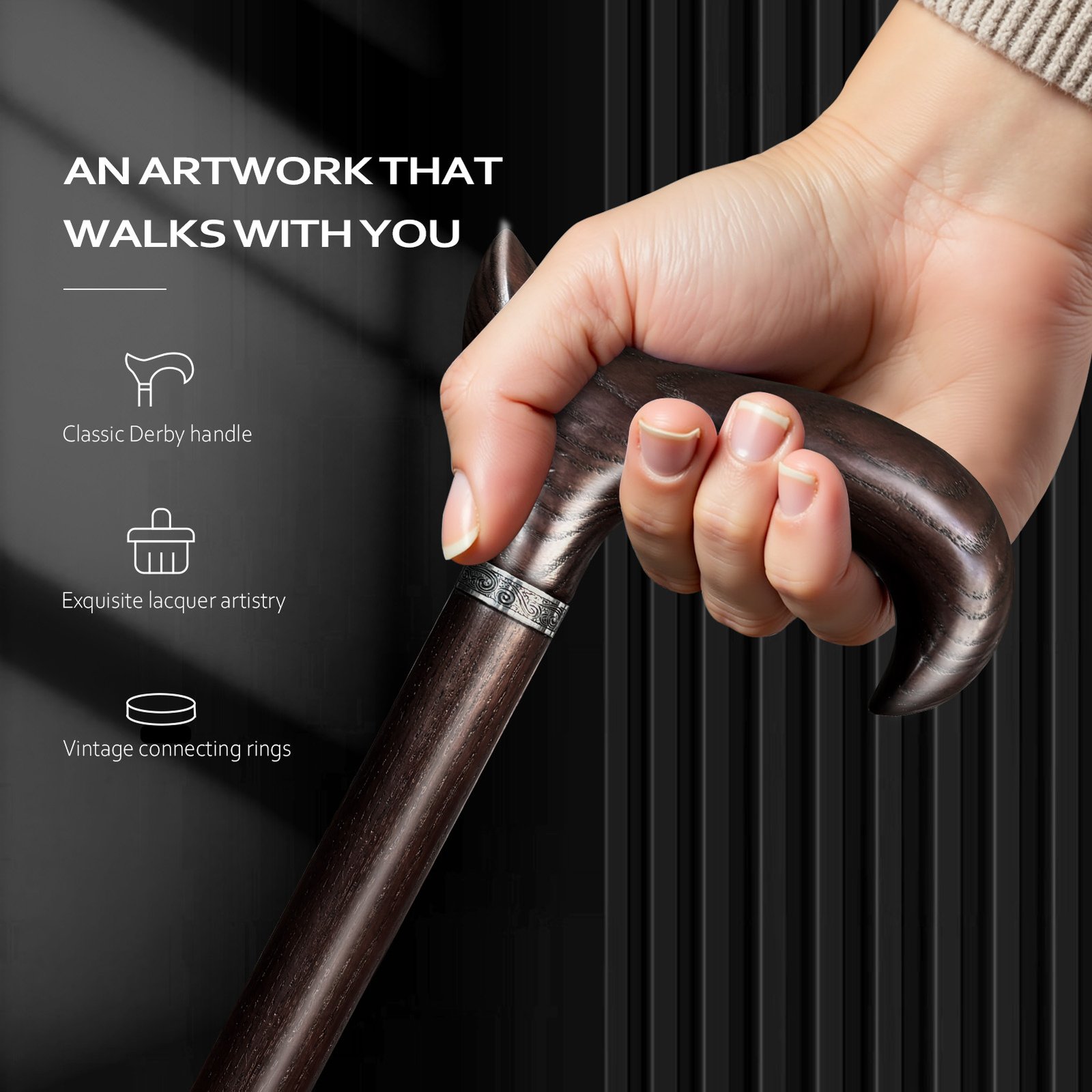 👀【Not Just A Walking Cane, But A Work Of Art】 This wooden cane continues the classic Derby handle design, with its curvature meticulously polished by artisans through countless refinements. Its ergonomic comfort and stylish appearance make it not only ideal for daily walking assistance for those with the most discerning standards but also perfect for leisurely strolls, shopping, social gatherings, and fashion coordination