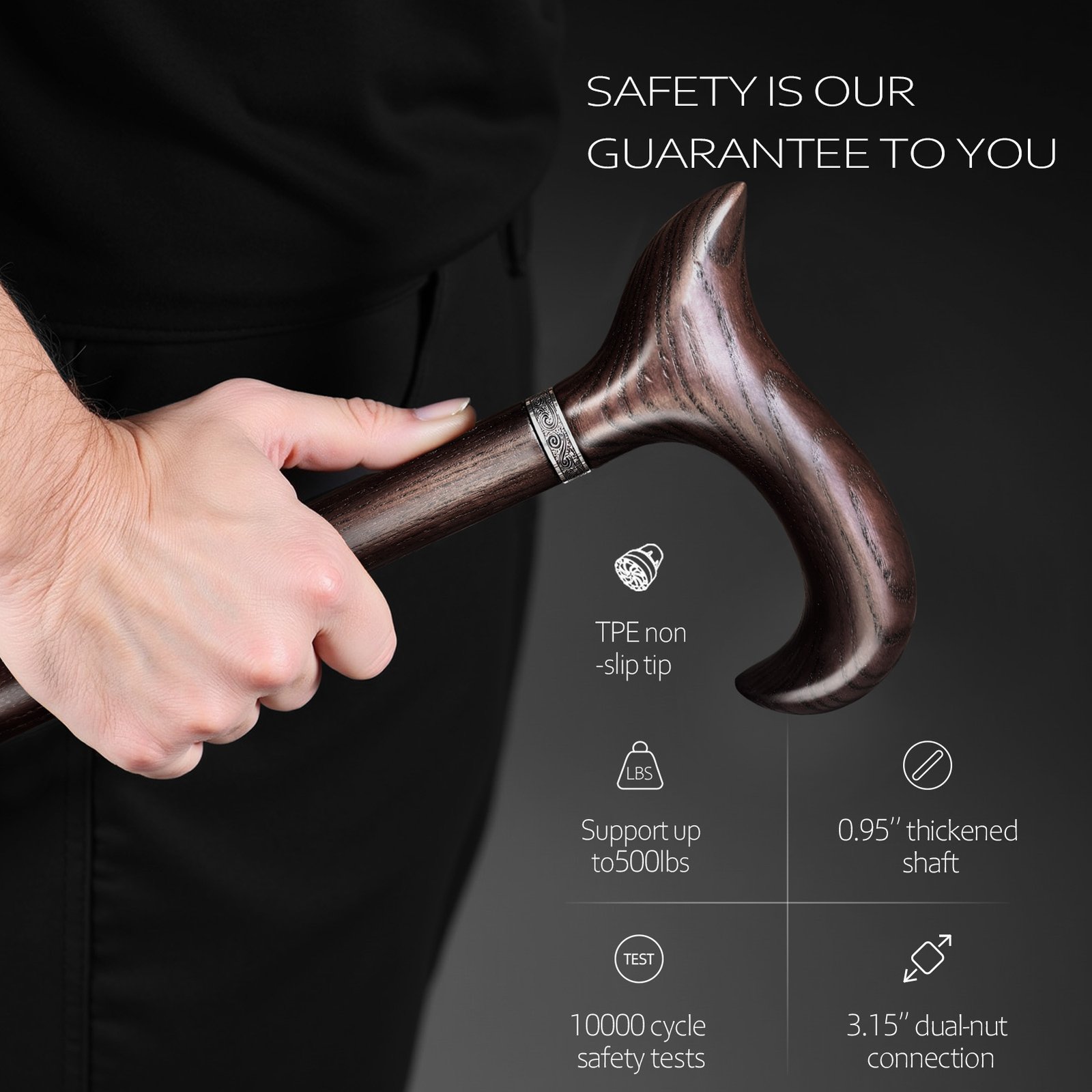 🦾【500 Lbs Weight Capacity, Combining Safety And Stability】 Crafted from selected high-density ash wood and wenge wood, this cane features a robust structure and built-in 3.15-inch dual-threaded nut connection mechanism, enabling it to support up to 500 pounds. Even larger individuals can rely on it with ease, making it a truly safe and stable wooden cane.