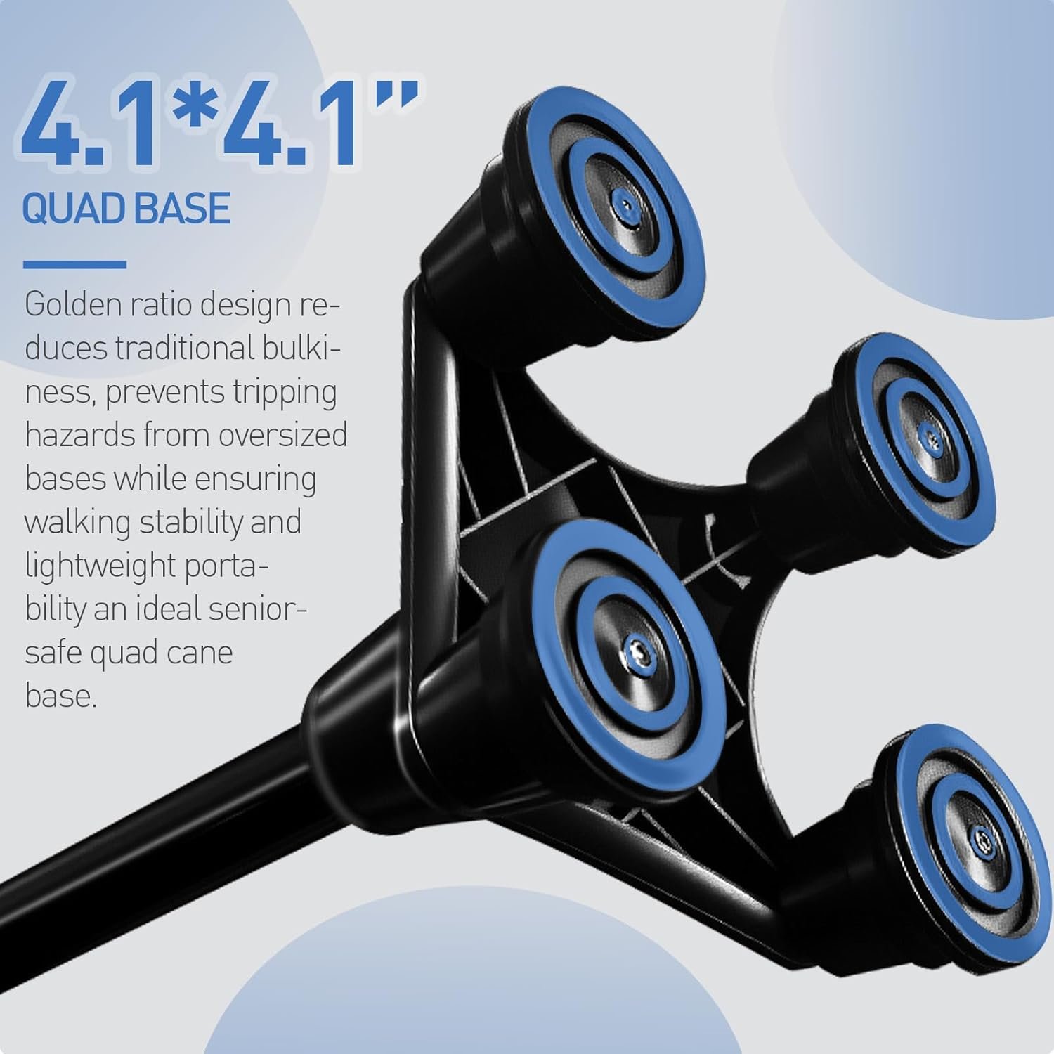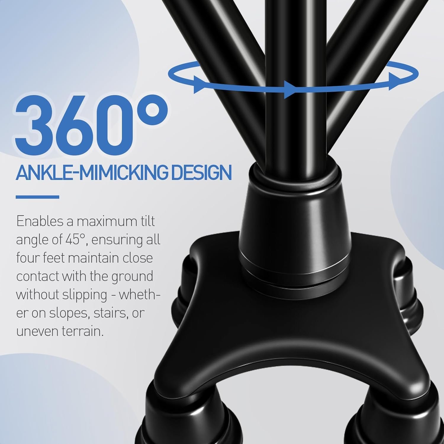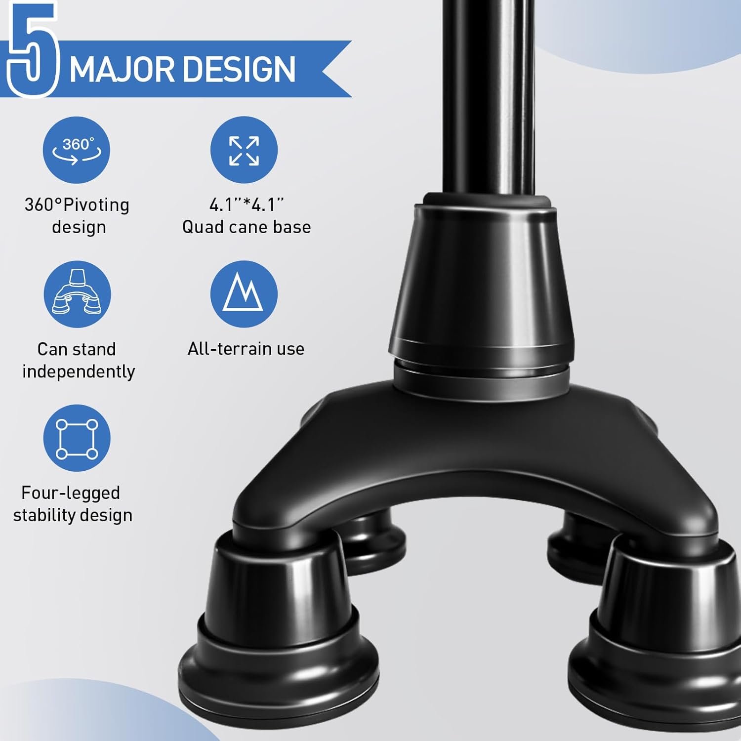 🦵【Self-Standing, Anti-Tip, Anti-Trip – Stable Four-Legged Independent Base】:Quad base 3/4 inch heavy duty four independent support legs form a broad, stable foundation, enabling the cane to stand upright autonomously. Place it securely beside tables or stair landings—eliminating bending to retrieve it and accidental tripping hazards. Ensures peace of mind during use.
