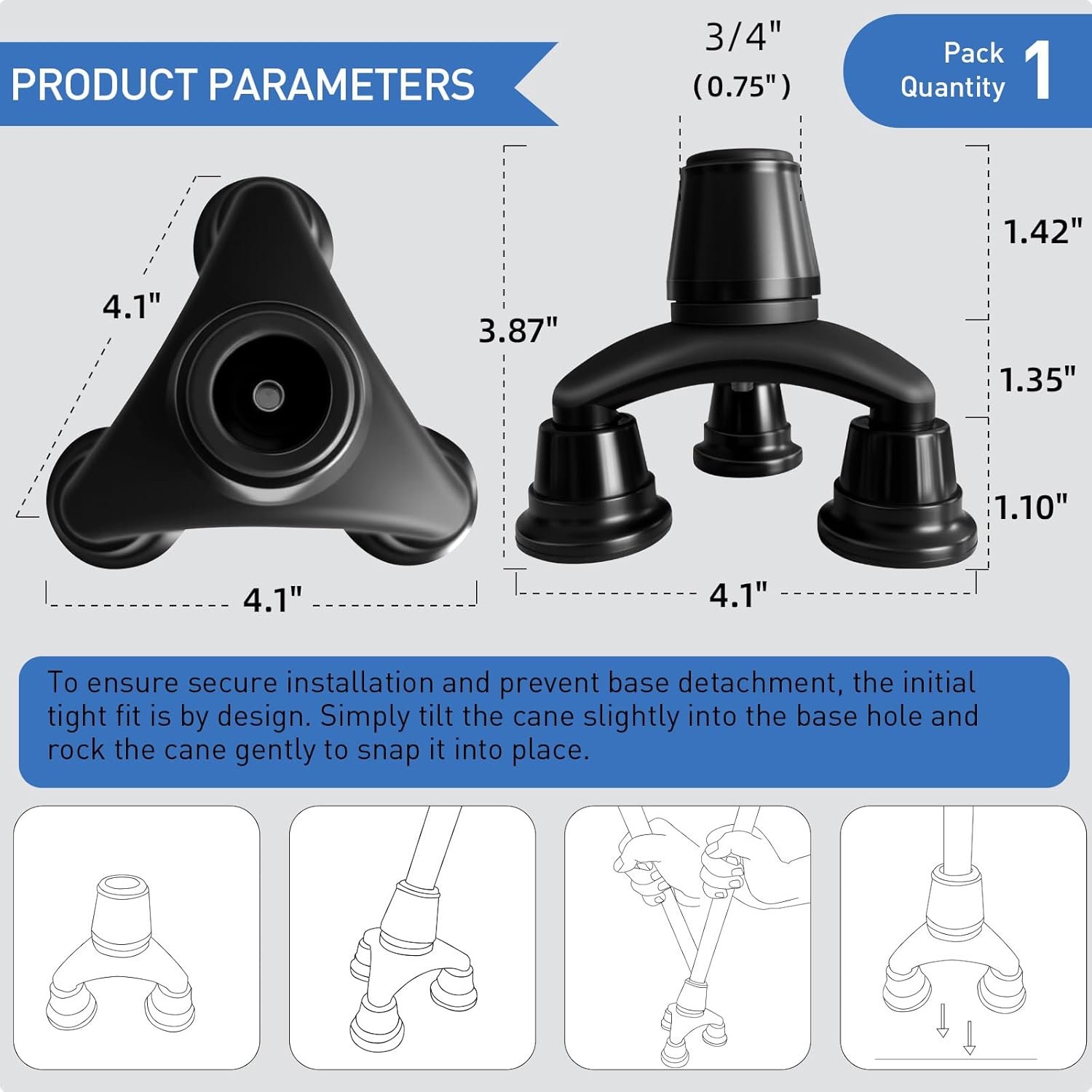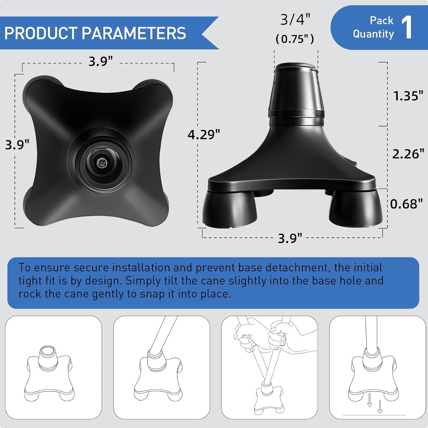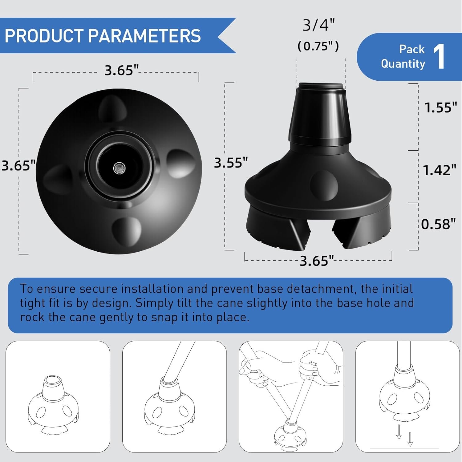 🖐️【5s Quick Installation – Compatible With 3/4 Inch Canes】This base precisely designed for mainstream 3/4 inch canes (not compatible with wooden canes). No tools required—align, press, and rotate the cane to securely lock within 5 seconds. Internal anti-detachment structure guarantees a firm, rattle-free connection
